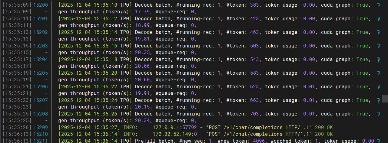 使用两张RTX 5090 GPU可实现约20 tokens/s的生成速度。推理日志如下图: