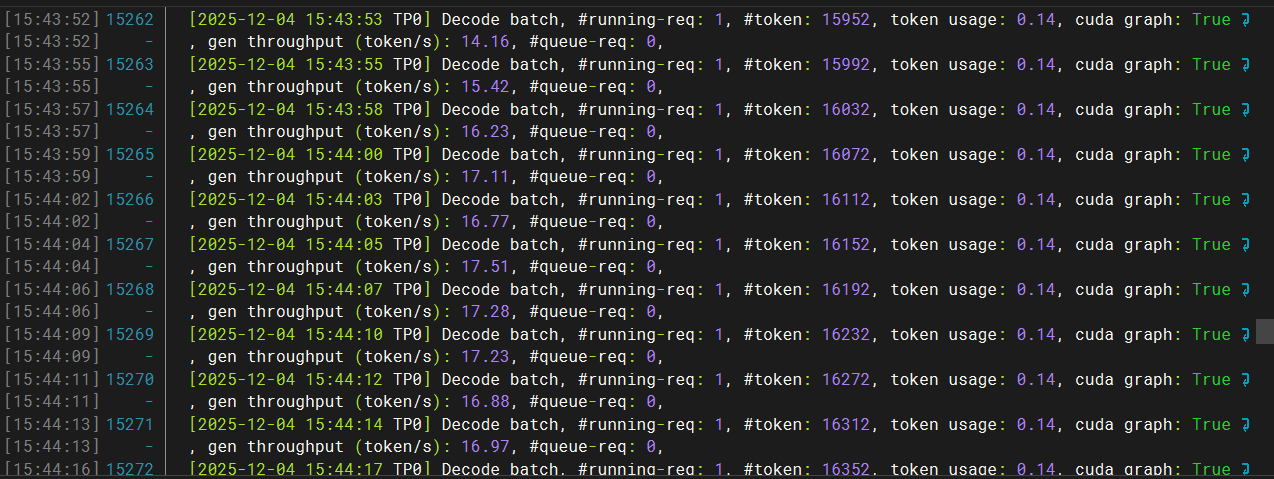 使用单张RTX 5090 GPU可实现约16 tokens/s的生成速度。推理日志如下图: